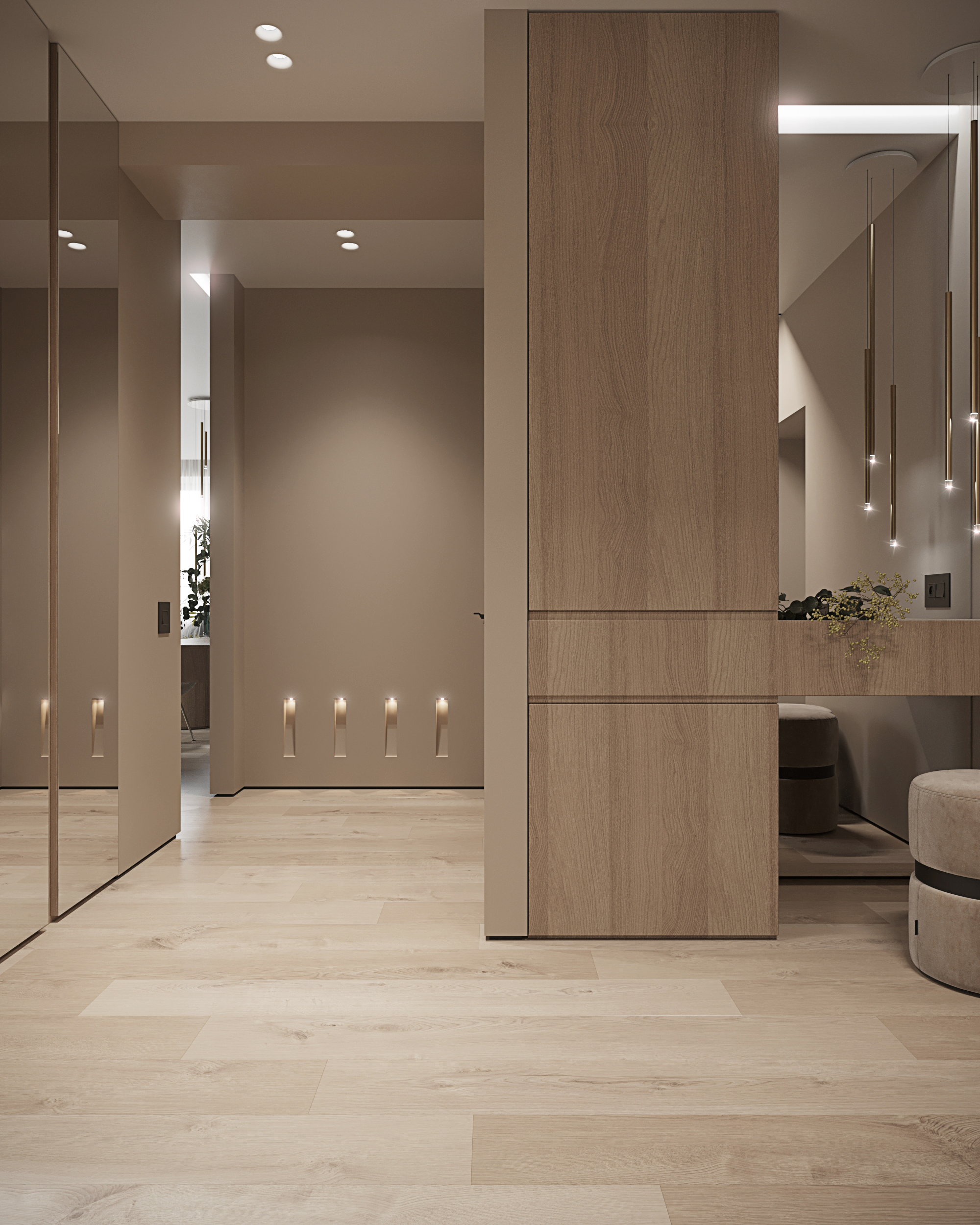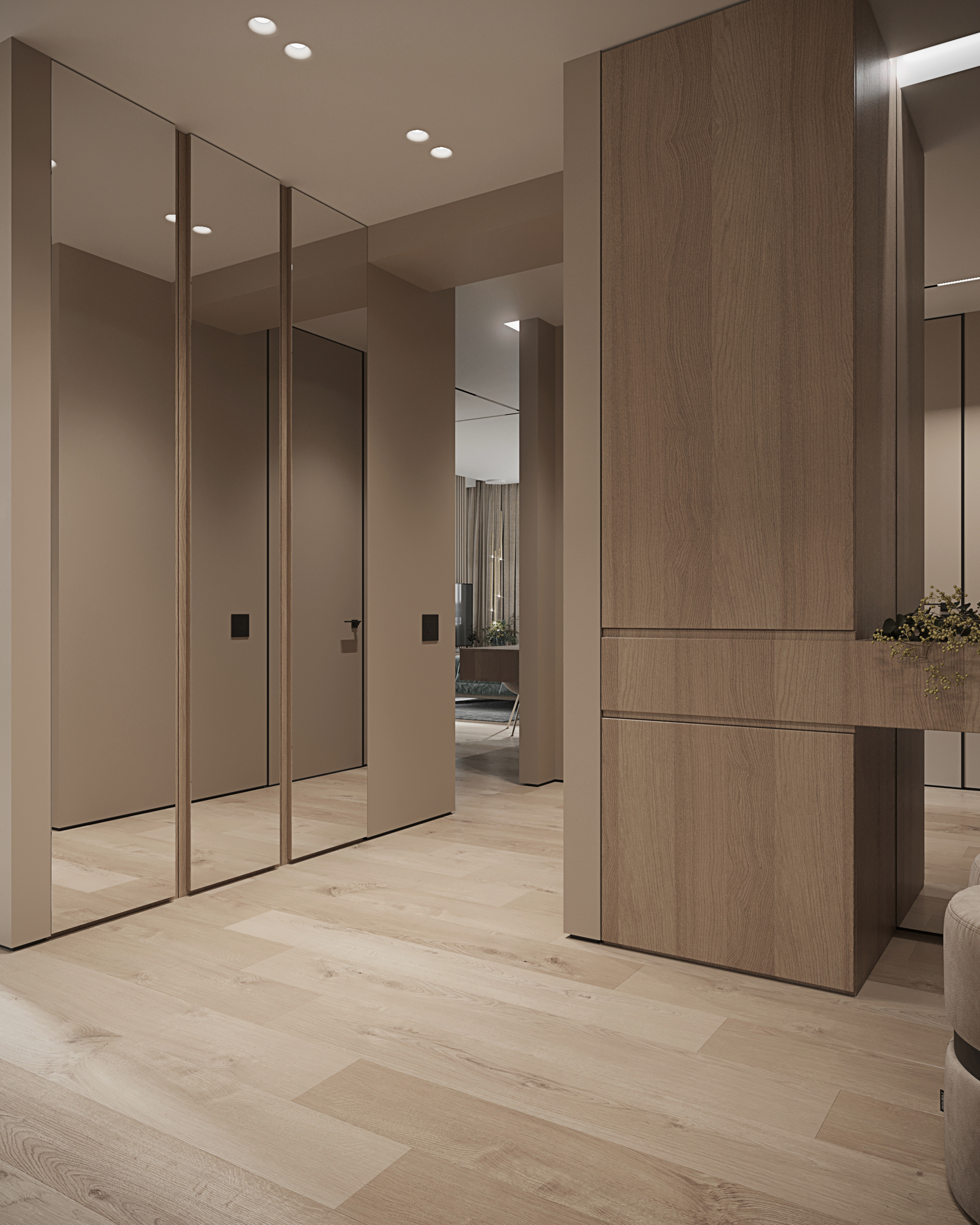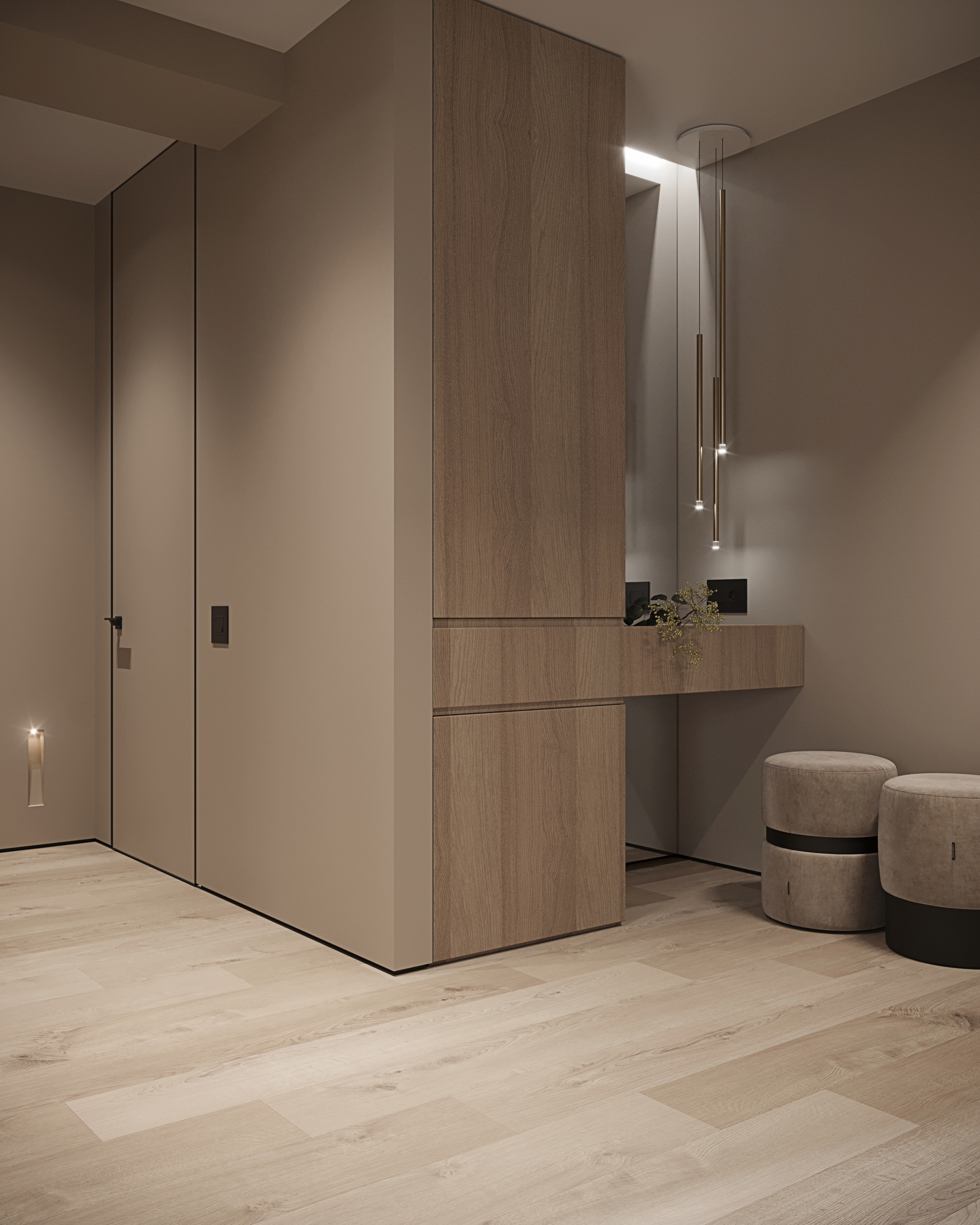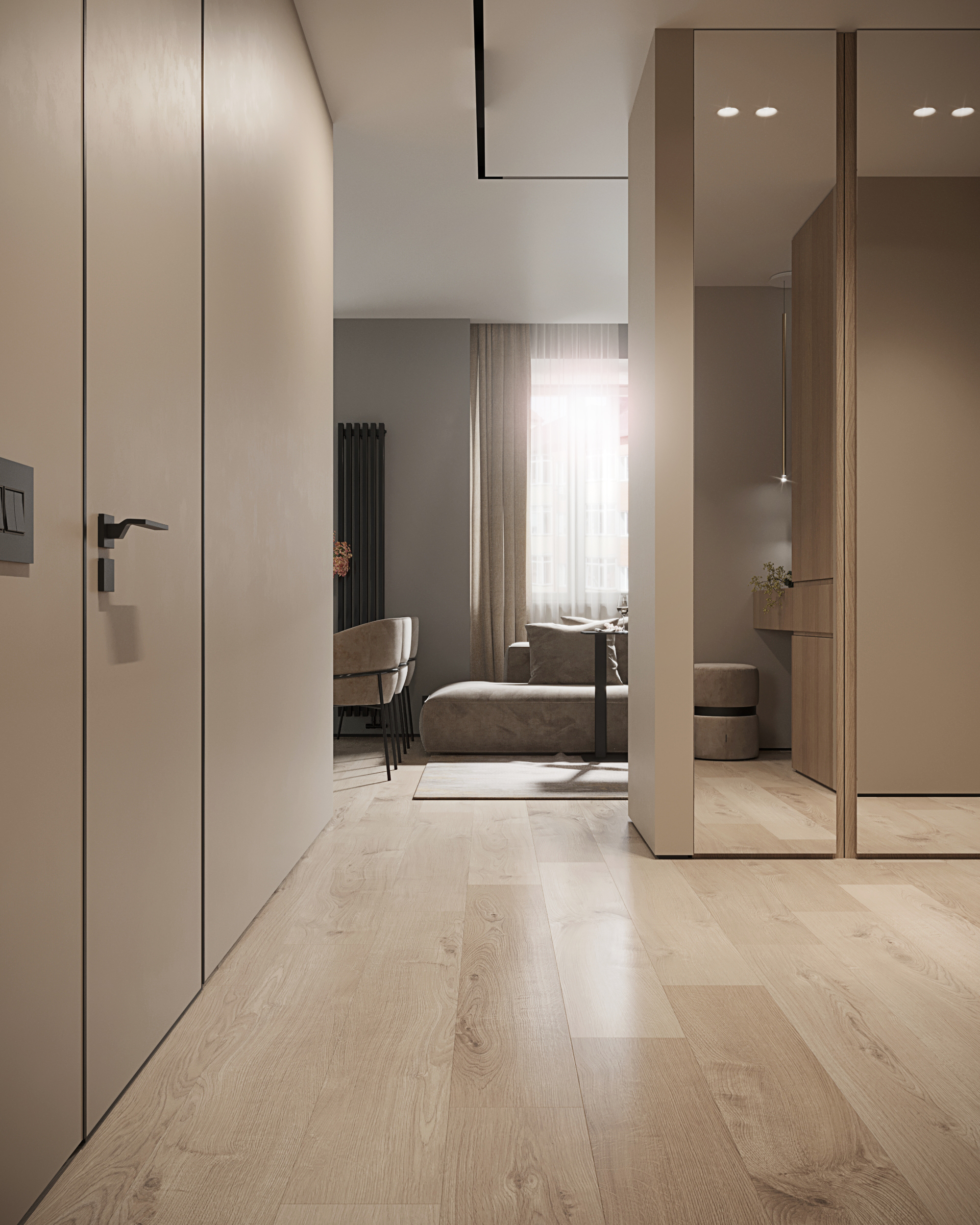 Палитра интерьера выбрана спокойная и расслабленная. Тёплые оттенки песчаника и средне-серый цвет, дополняют и уравновешивают друг друга по всей квартире. Акцентом идут чёрные графичные линии теневого профиля и магнитной системы освещения. Они замыкают и объединяют все помещения в единый контур. Ощущение цельности всего объёма квартиры придаёт напольное покрытие, которое сплошным полотном без перепадов уровня и порогов идет по всей квартире, а также скрытые двери в потолок под штукатурку. С помощью таких дверей возможно решение задачи визуального изменения пространства. Плоскость таких дверей в открытом, закрытом или полуоткрытом состоянии имитирует стену от пола до потолка, создавая архитектурное преломление плоскостей, света и тени и визуально вытягивает помещение вверх.