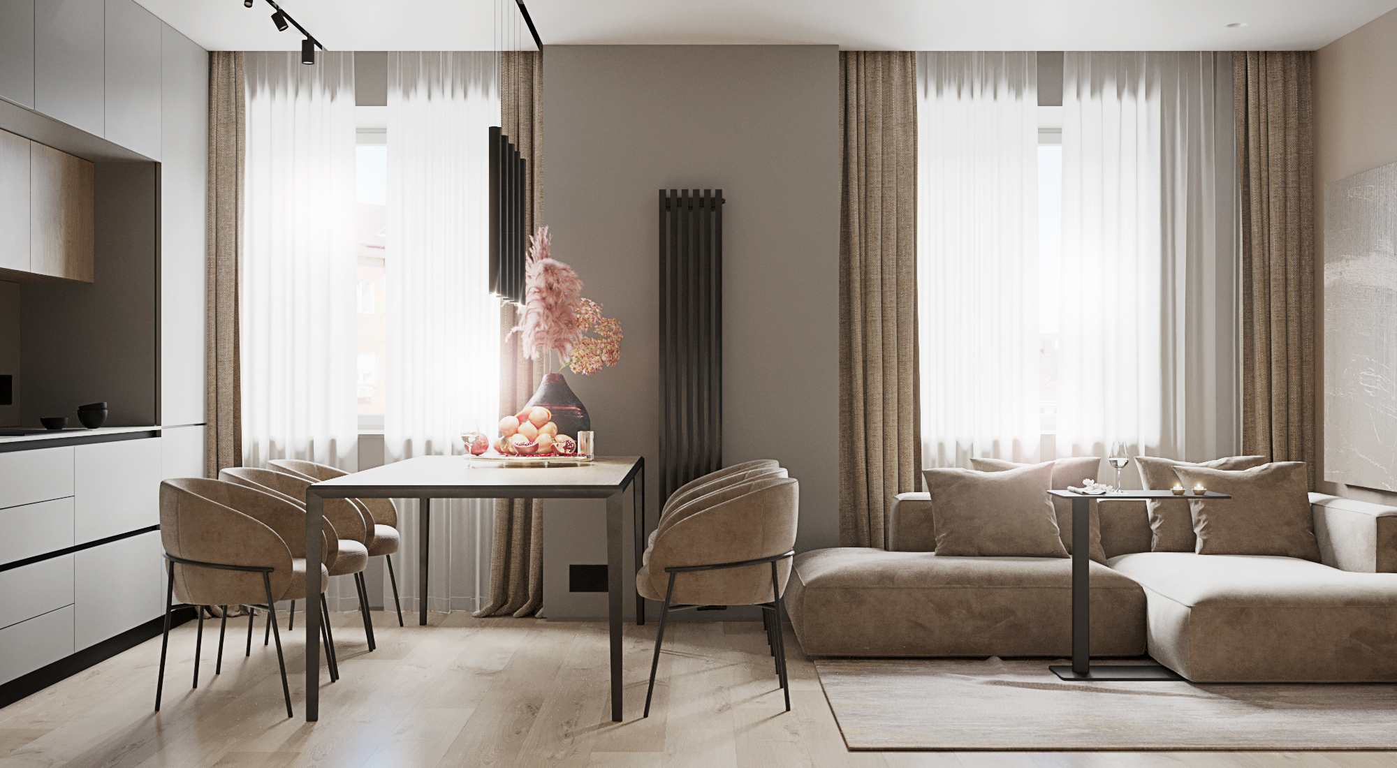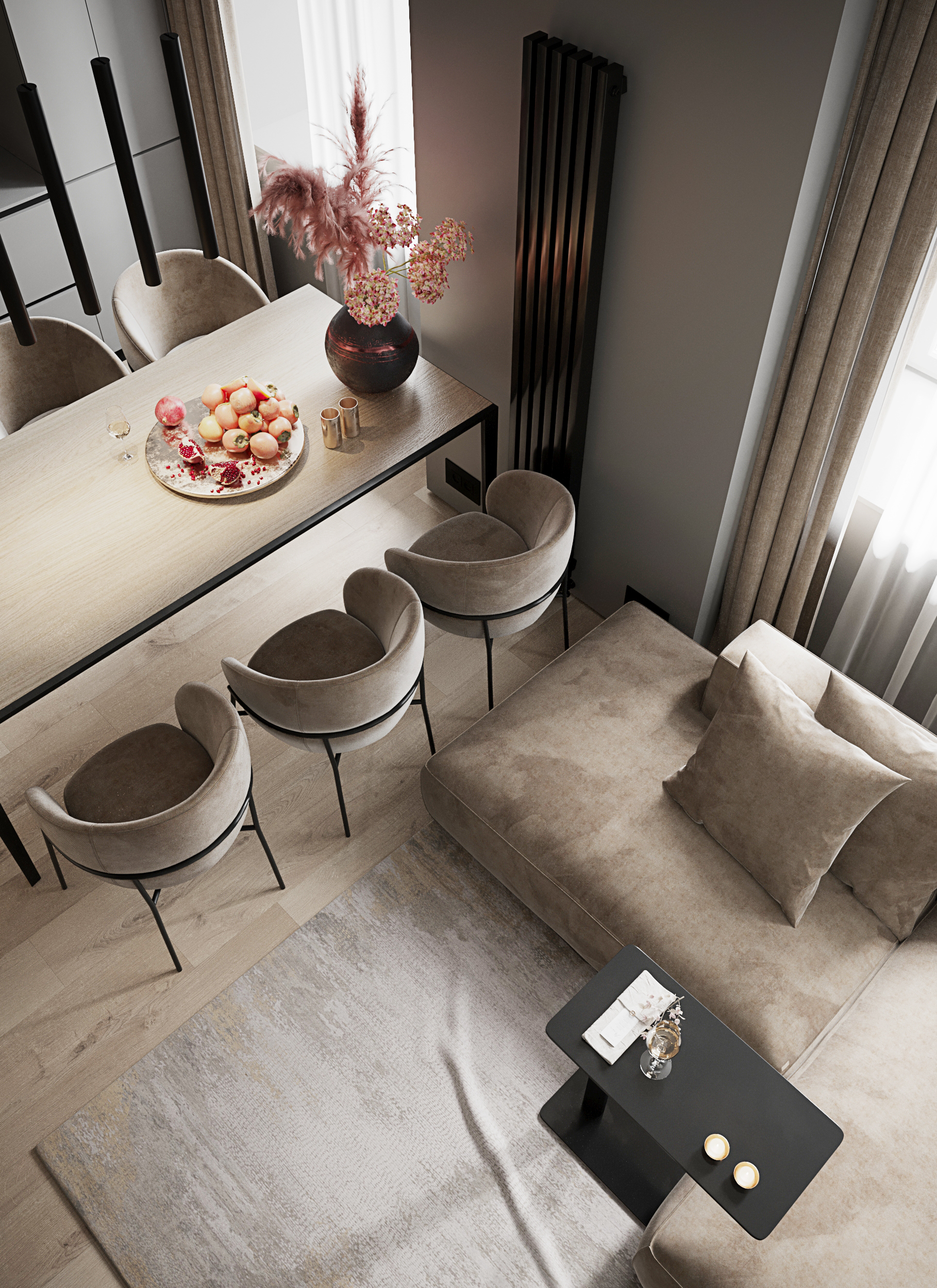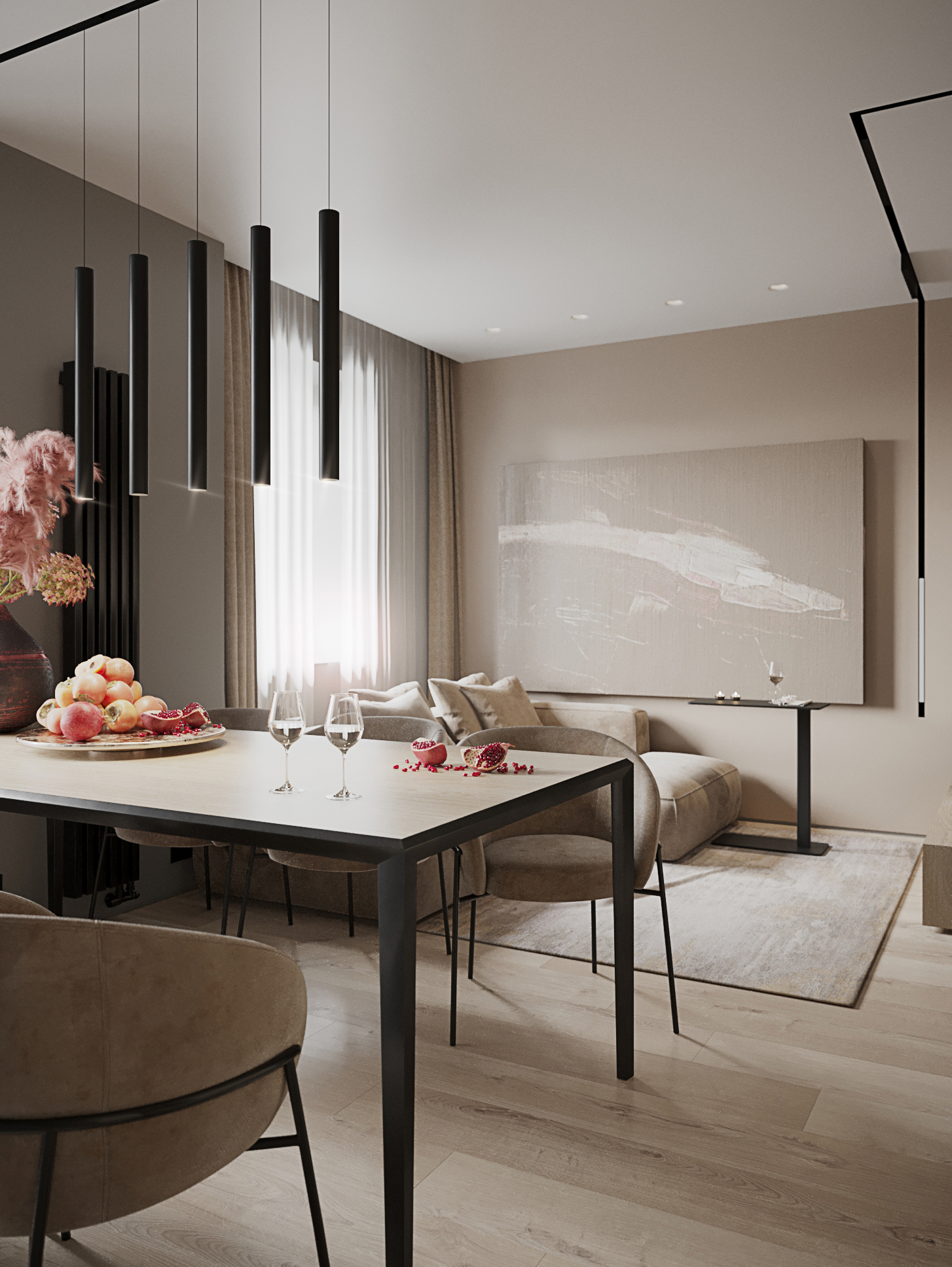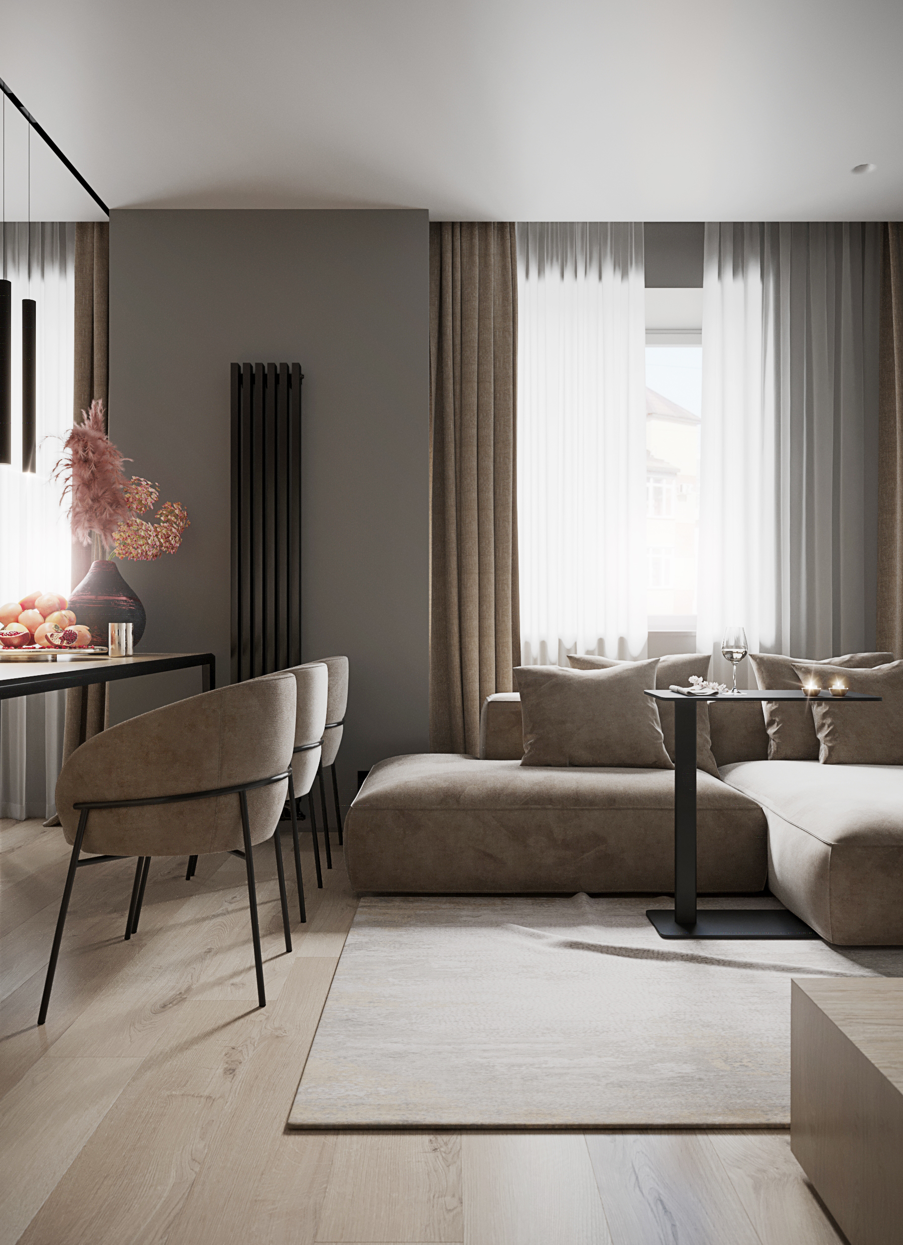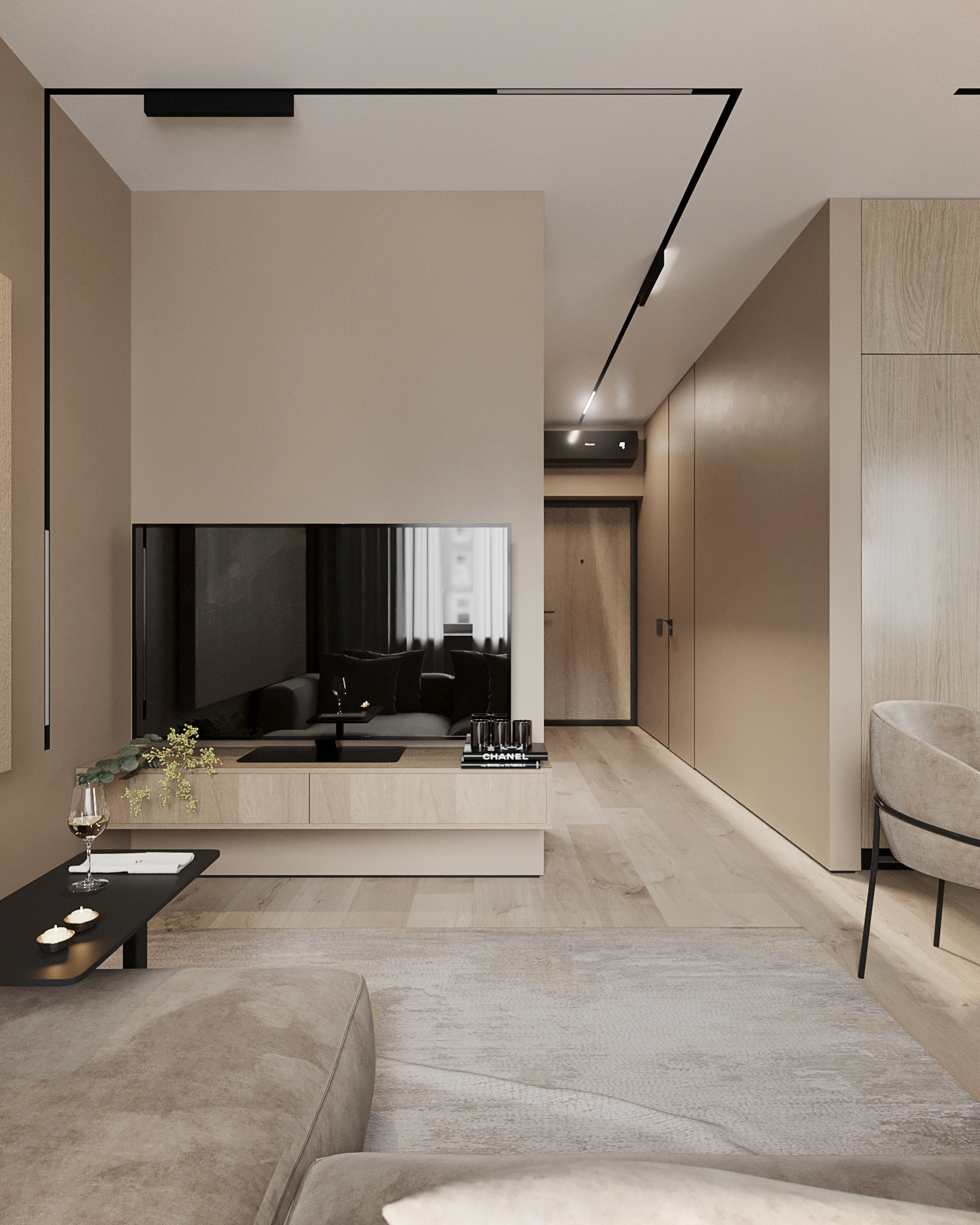 Палитра интерьера выбрана спокойная и расслабленная. Тёплые оттенки песчаника и средне-серый цвет, дополняют и уравновешивают друг друга по всей квартире. Акцентом идут чёрные графичные линии теневого профиля и магнитной системы освещения. Они замыкают и объединяют все помещения в единый контур. Ощущение цельности всего объёма квартиры придаёт напольное покрытие, которое сплошным полотном без перепадов уровня и порогов идет по всей квартире, а также скрытые двери в потолок под штукатурку. С помощью таких дверей возможно решение задачи визуального изменения пространства. Плоскость таких дверей в открытом, закрытом или полуоткрытом состоянии имитирует стену от пола до потолка, создавая архитектурное преломление плоскостей, света и тени и визуально вытягивает помещение вверх.