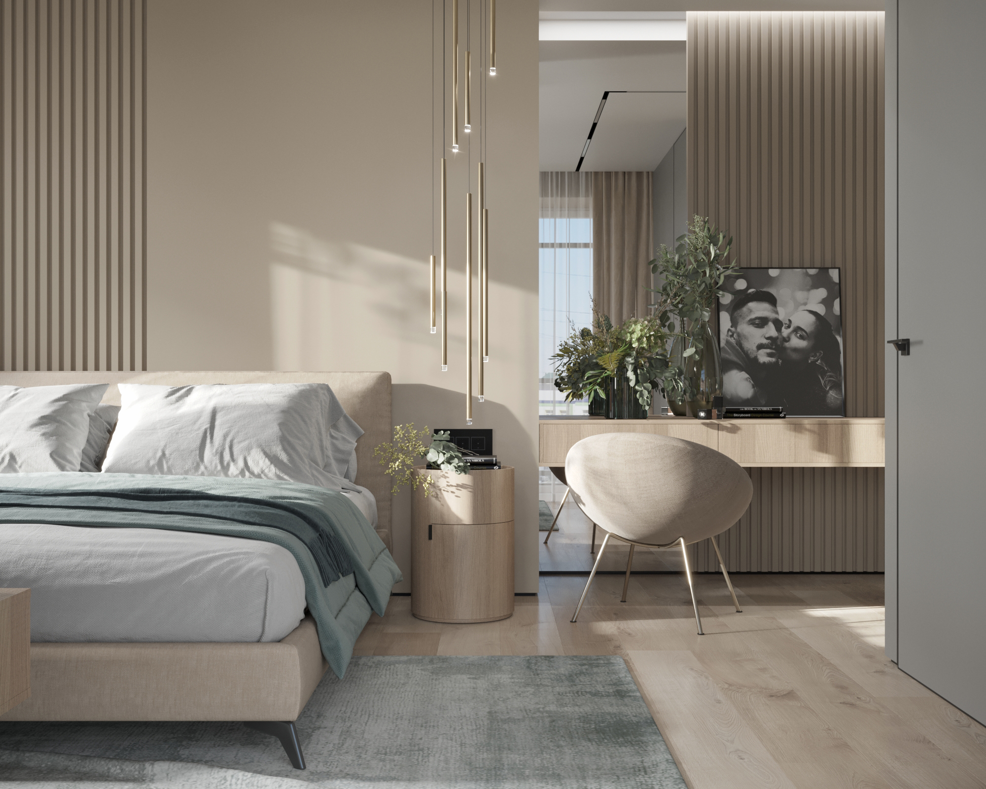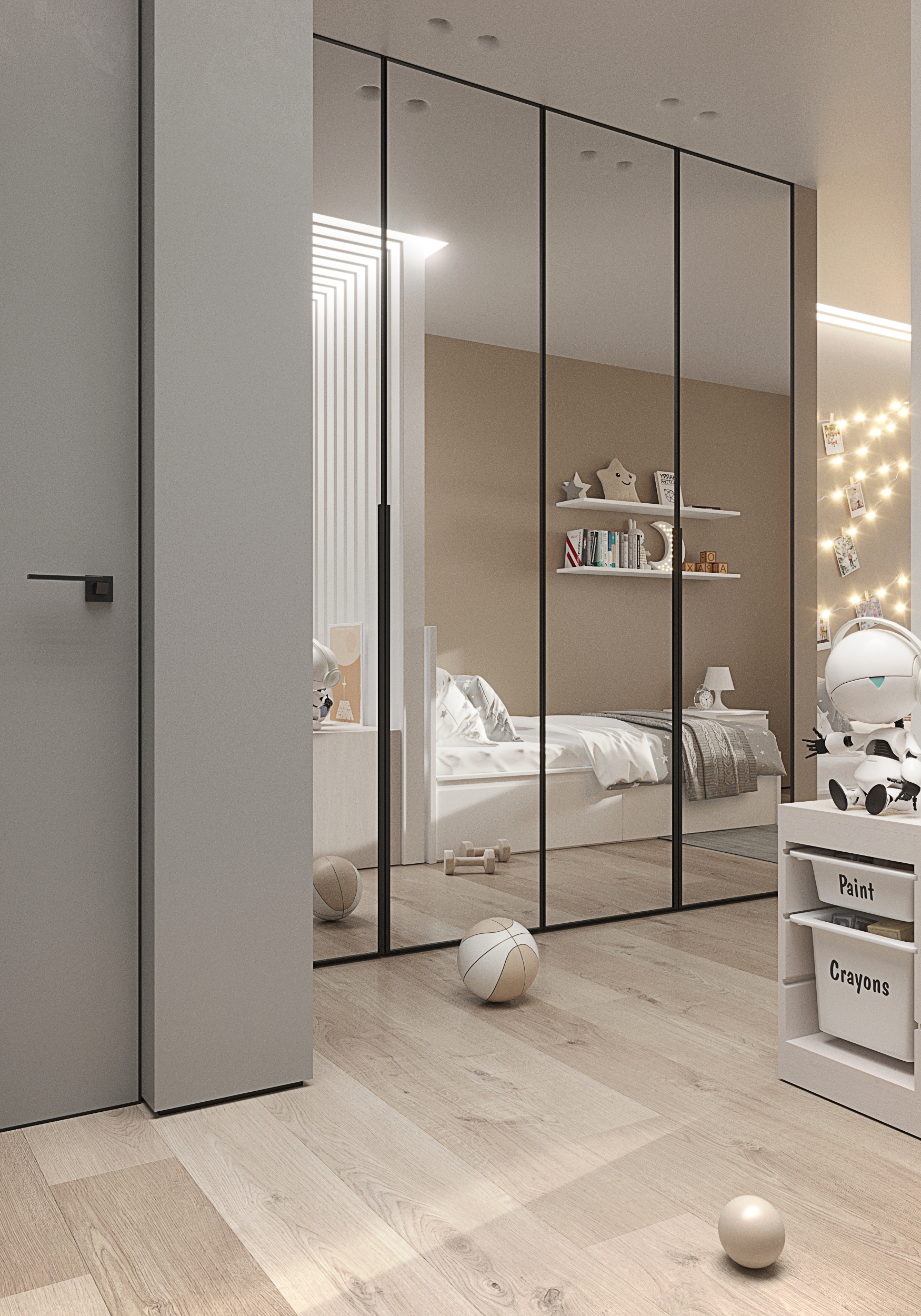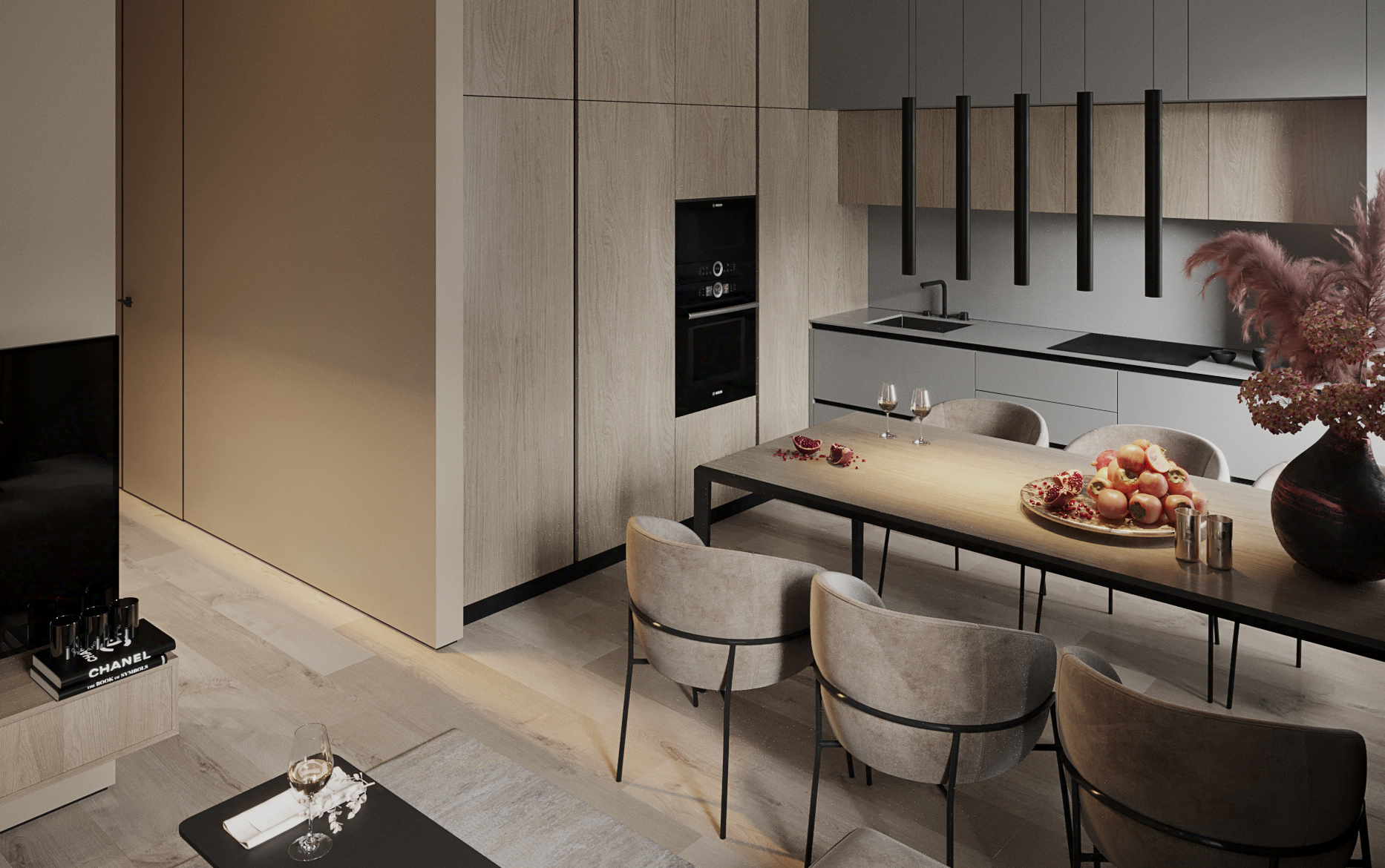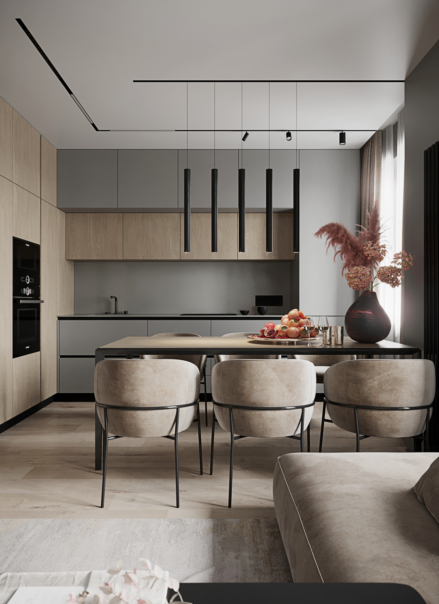 Палитра интерьера выбрана спокойная и расслабленная. Тёплые оттенки песчаника и средне-серый цвет, дополняют и уравновешивают друг друга по всей квартире. Акцентом идут чёрные графичные линии теневого профиля и магнитной системы освещения. Они замыкают и объединяют все помещения в единый контур. Ощущение цельности всего объёма квартиры придаёт напольное покрытие, которое сплошным полотном без перепадов уровня и порогов идет по всей квартире, а также скрытые двери в потолок под штукатурку. С помощью таких дверей возможно решение задачи визуального изменения пространства. Плоскость таких дверей в открытом, закрытом или полуоткрытом состоянии имитирует стену от пола до потолка, создавая архитектурное преломление плоскостей, света и тени и визуально вытягивает помещение вверх.