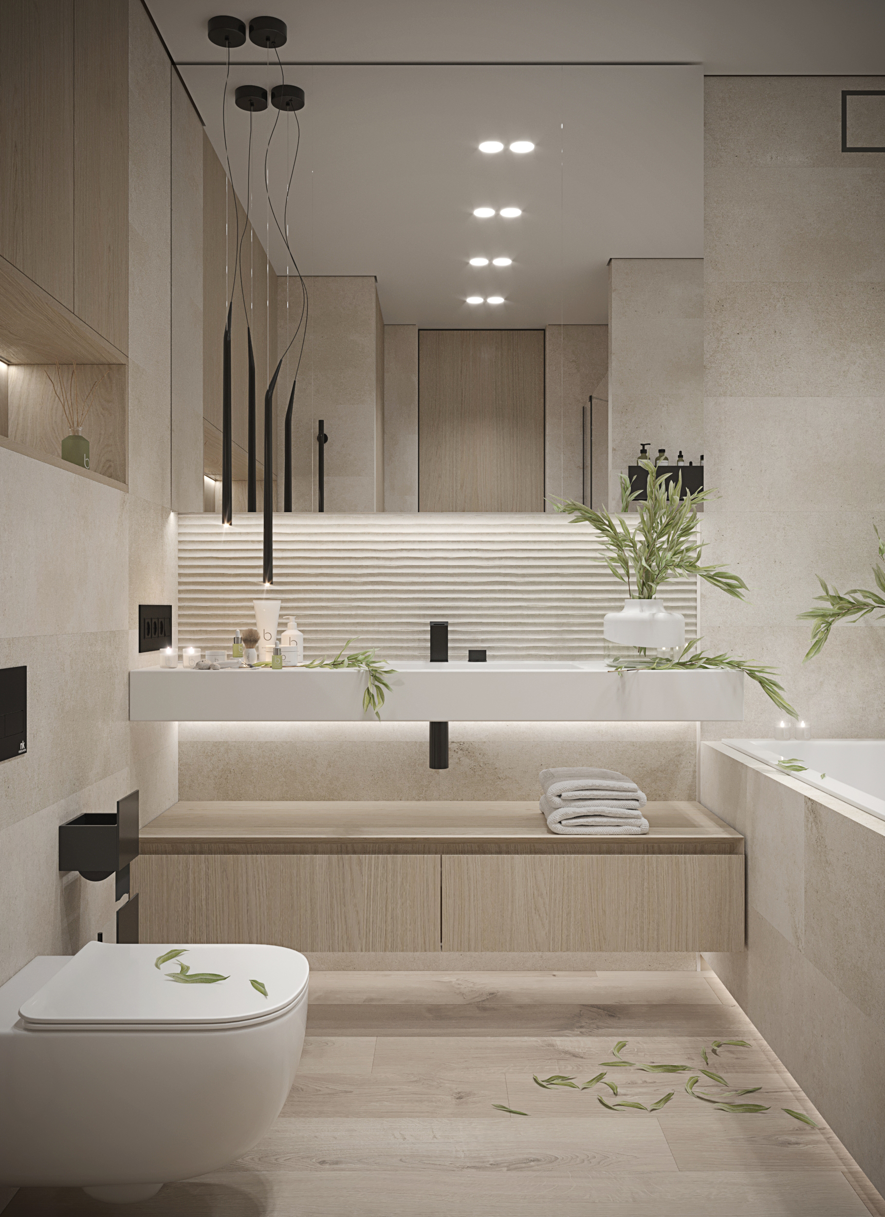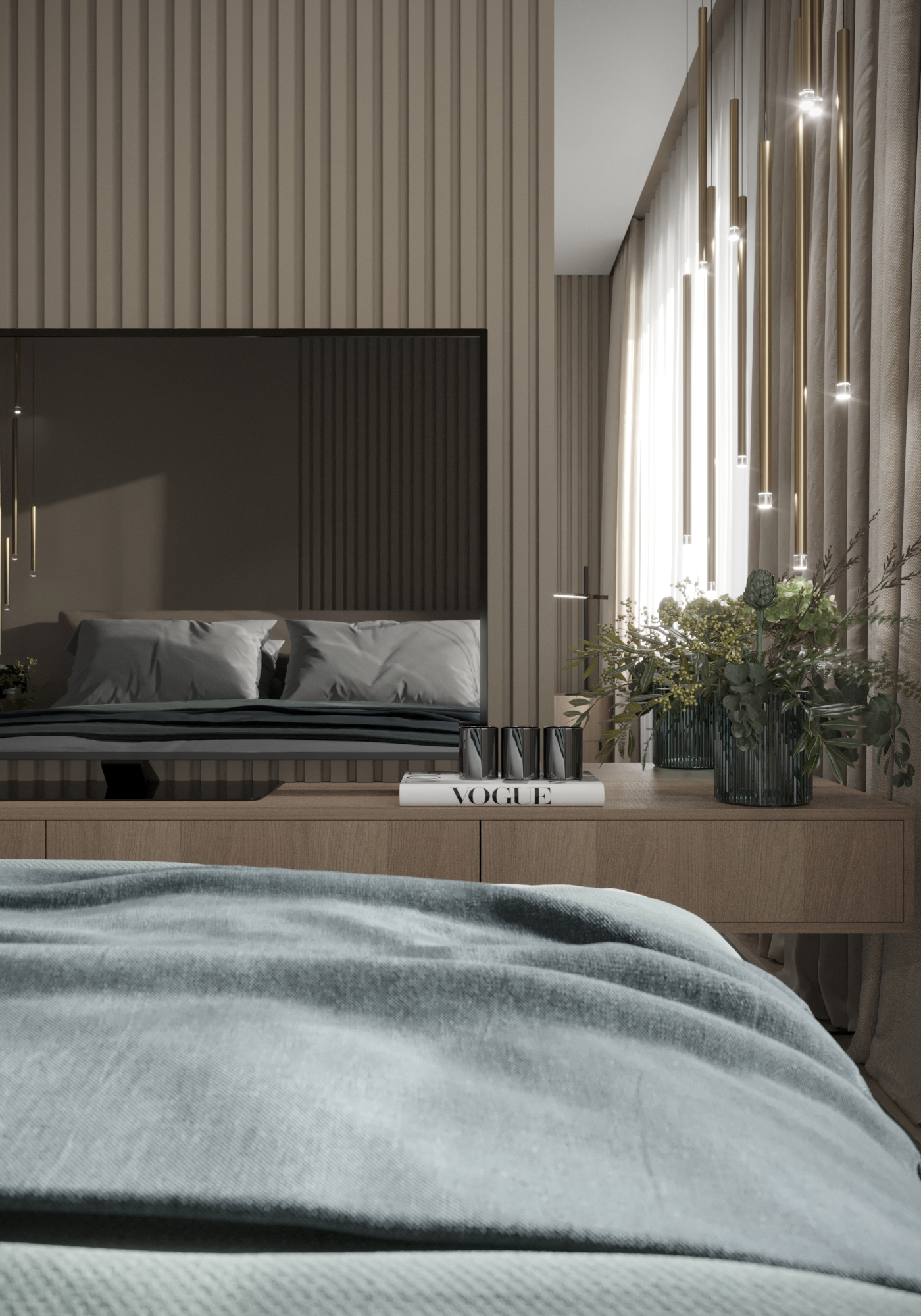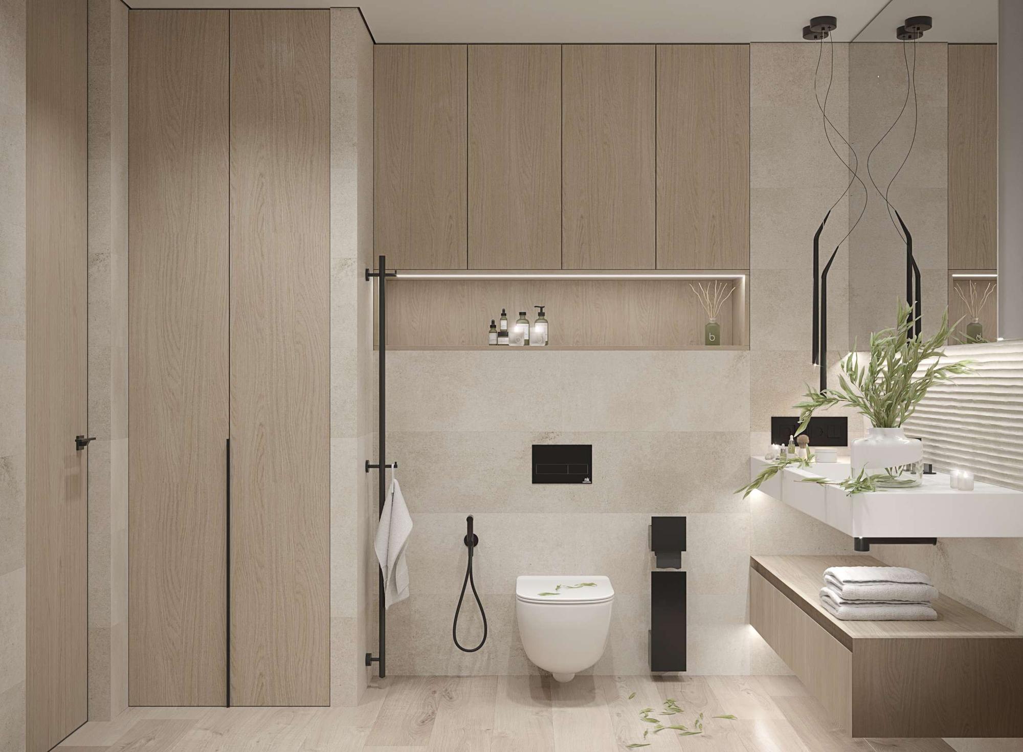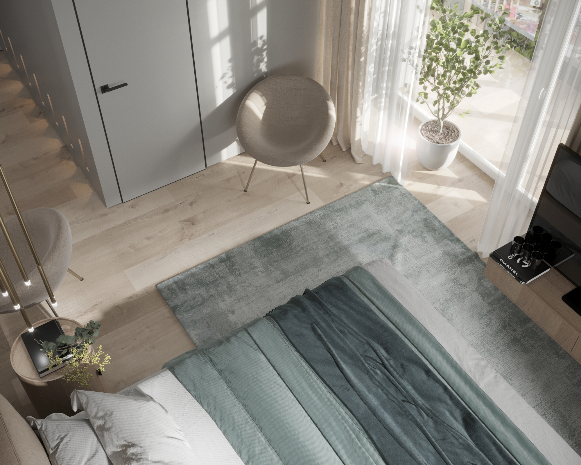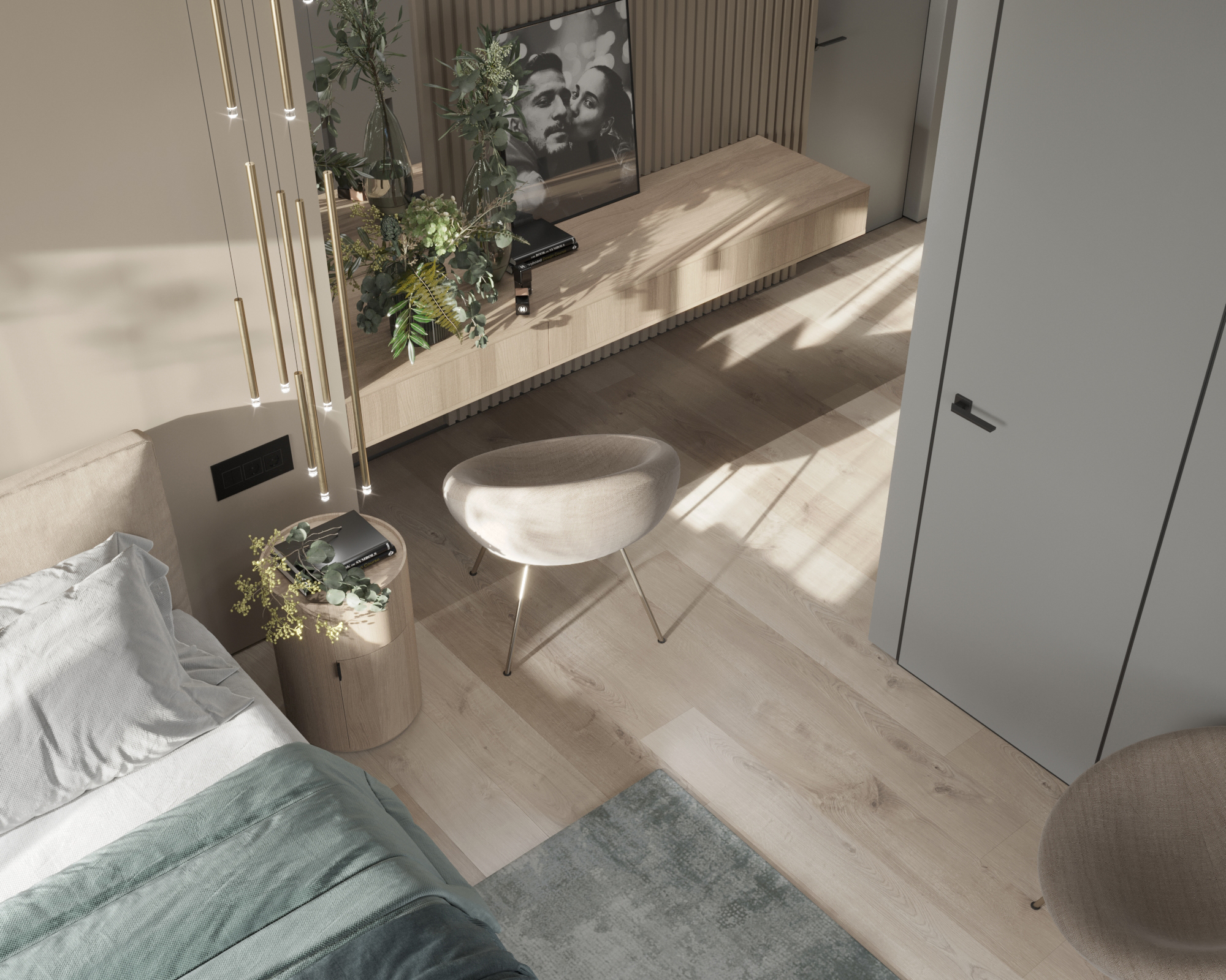 Палитра интерьера выбрана спокойная и расслабленная. Тёплые оттенки песчаника и средне-серый цвет, дополняют и уравновешивают друг друга по всей квартире. Акцентом идут чёрные графичные линии теневого профиля и магнитной системы освещения. Они замыкают и объединяют все помещения в единый контур. Ощущение цельности всего объёма квартиры придаёт напольное покрытие, которое сплошным полотном без перепадов уровня и порогов идет по всей квартире, а также скрытые двери в потолок под штукатурку. С помощью таких дверей возможно решение задачи визуального изменения пространства. Плоскость таких дверей в открытом, закрытом или полуоткрытом состоянии имитирует стену от пола до потолка, создавая архитектурное преломление плоскостей, света и тени и визуально вытягивает помещение вверх.