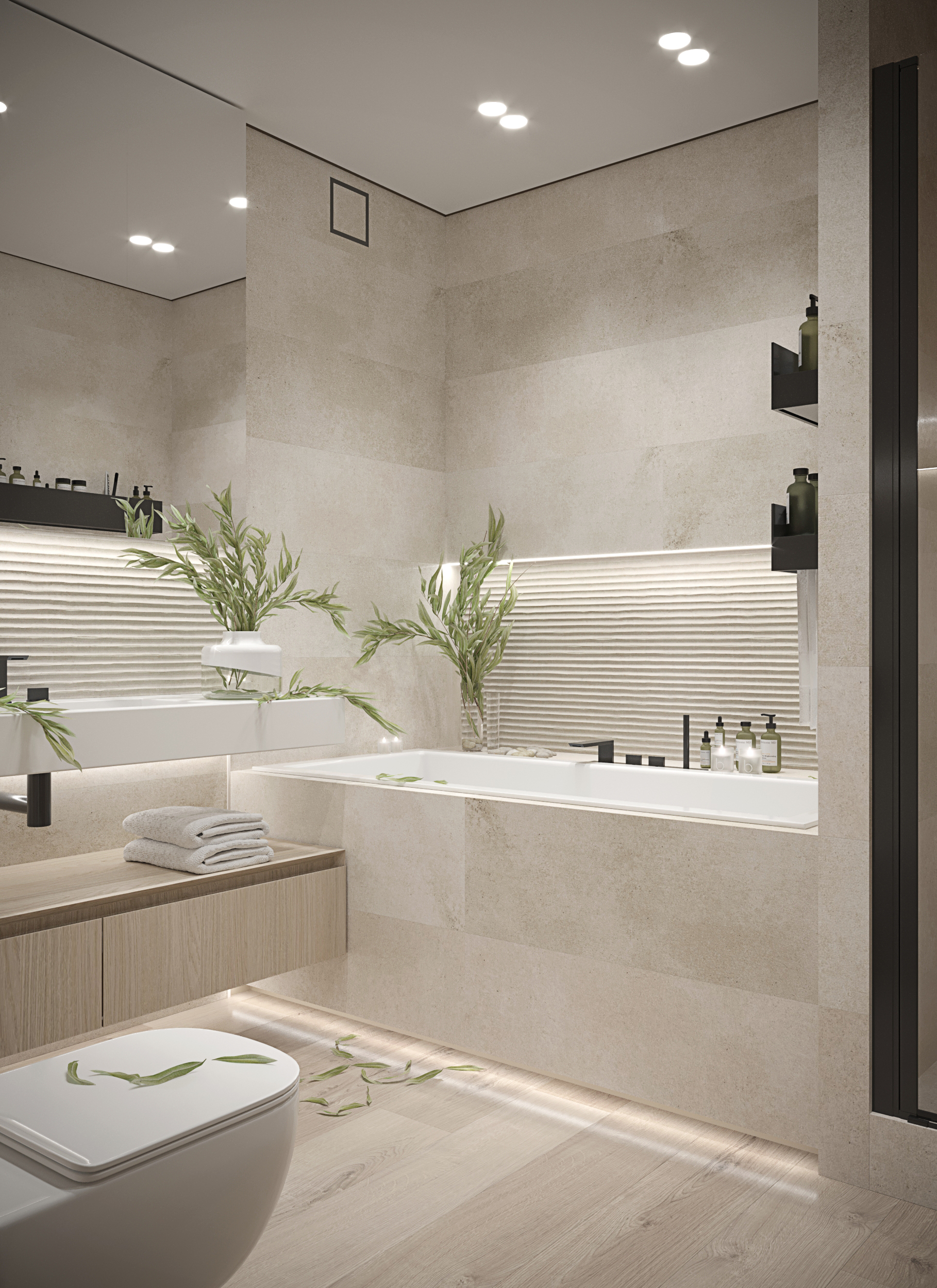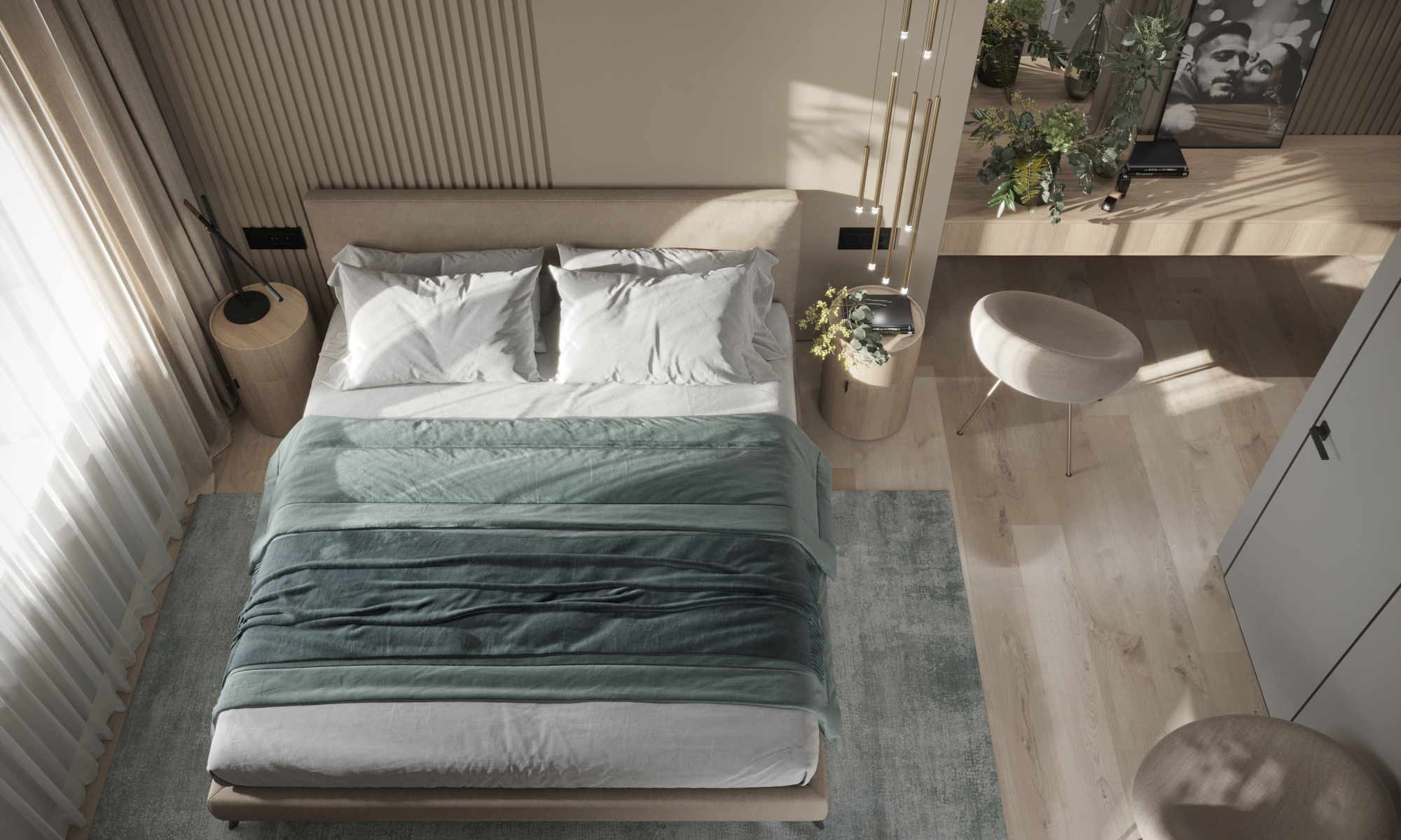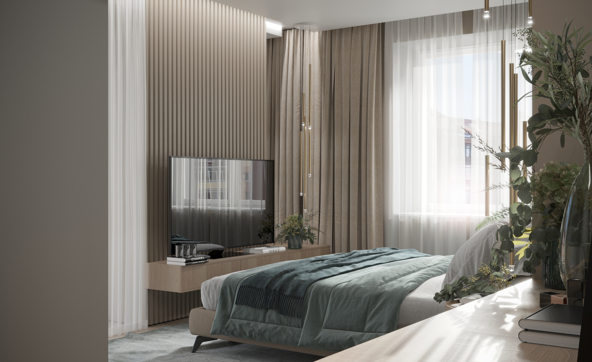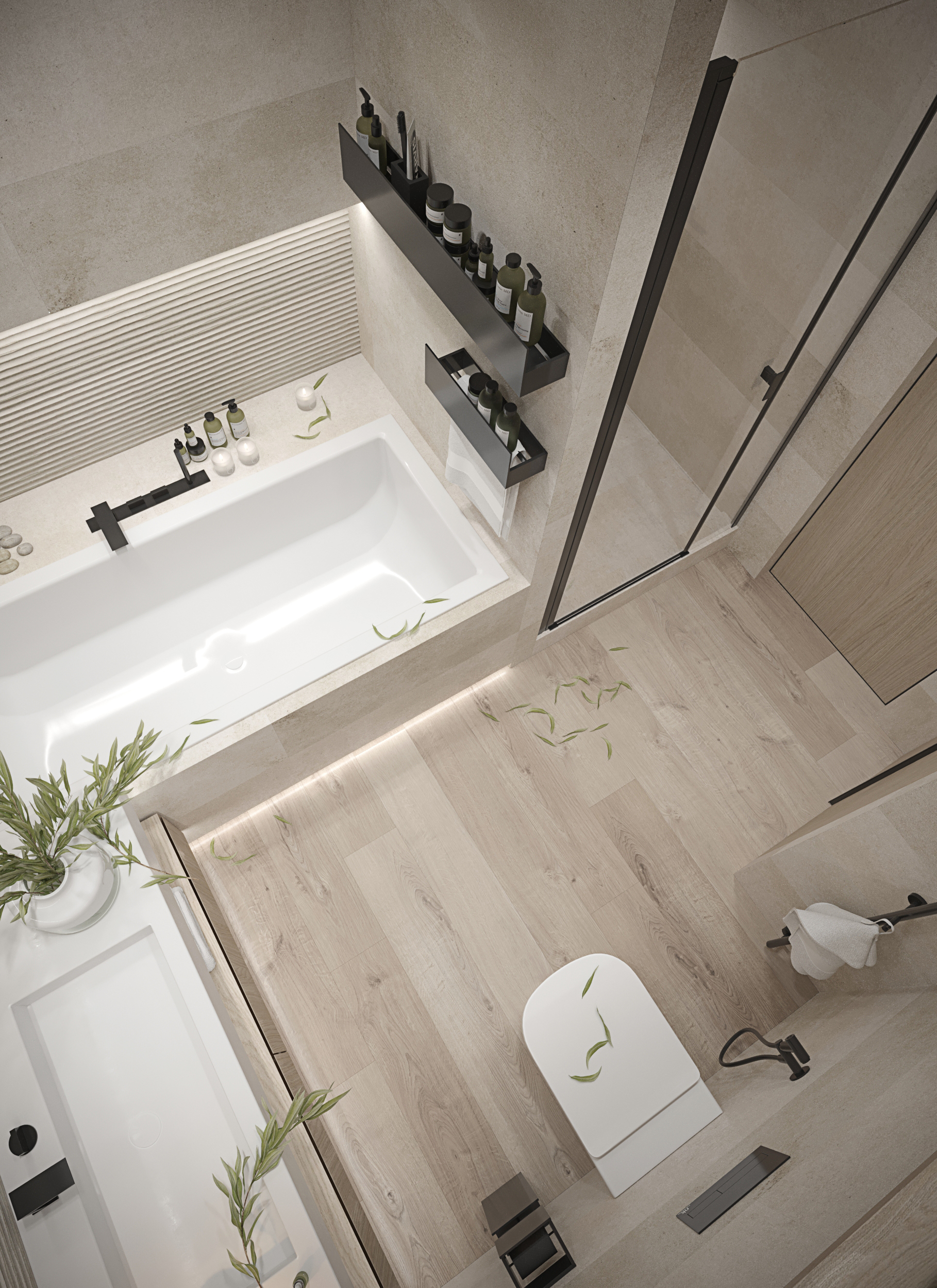 Палитра интерьера выбрана спокойная и расслабленная. Тёплые оттенки песчаника и средне-серый цвет, дополняют и уравновешивают друг друга по всей квартире. Акцентом идут чёрные графичные линии теневого профиля и магнитной системы освещения. Они замыкают и объединяют все помещения в единый контур. Ощущение цельности всего объёма квартиры придаёт напольное покрытие, которое сплошным полотном без перепадов уровня и порогов идет по всей квартире, а также скрытые двери в потолок под штукатурку. С помощью таких дверей возможно решение задачи визуального изменения пространства. Плоскость таких дверей в открытом, закрытом или полуоткрытом состоянии имитирует стену от пола до потолка, создавая архитектурное преломление плоскостей, света и тени и визуально вытягивает помещение вверх.