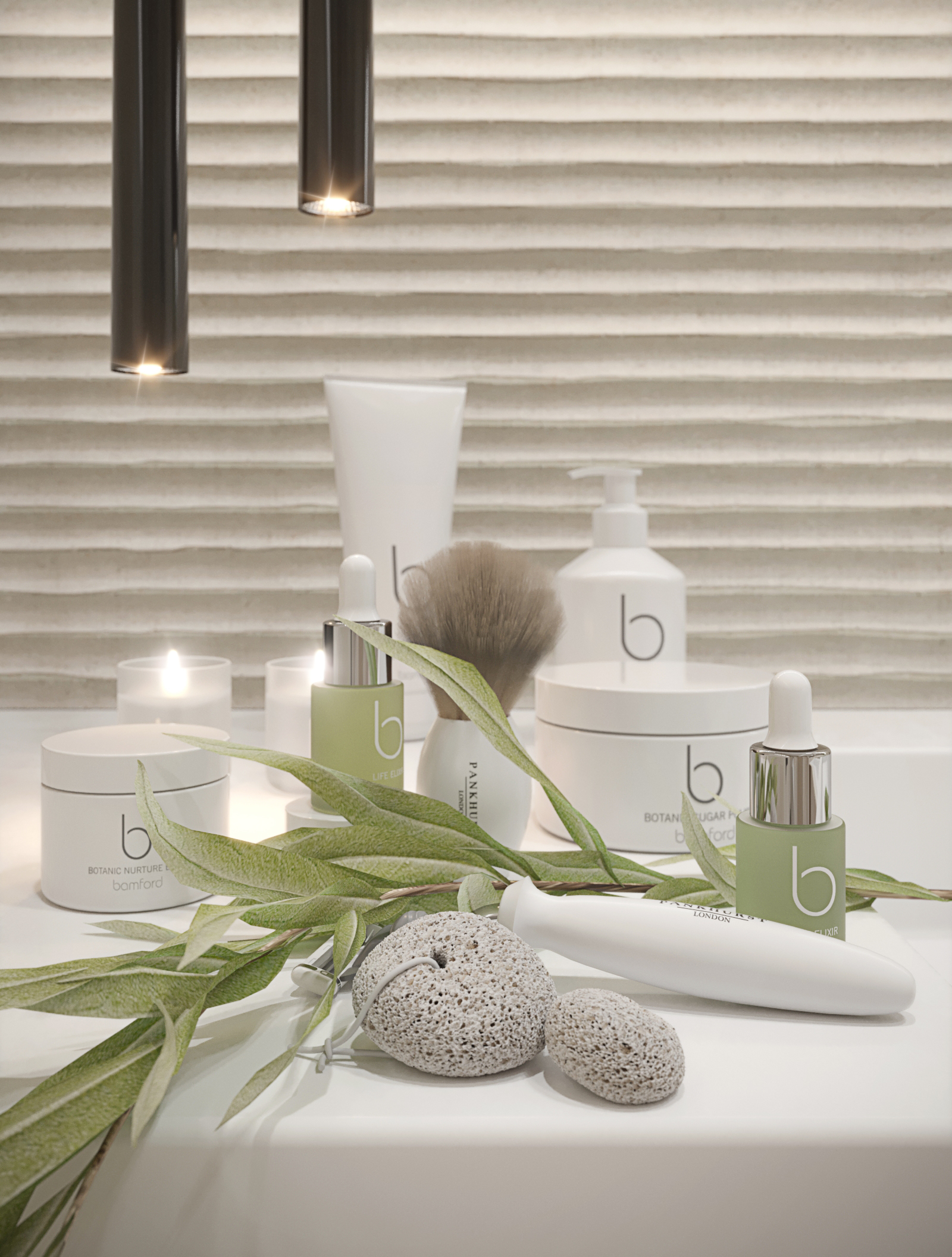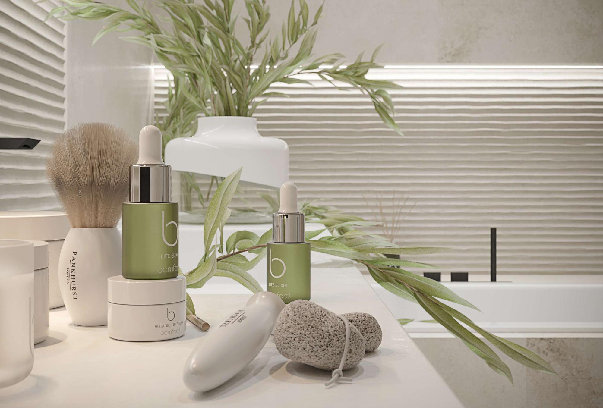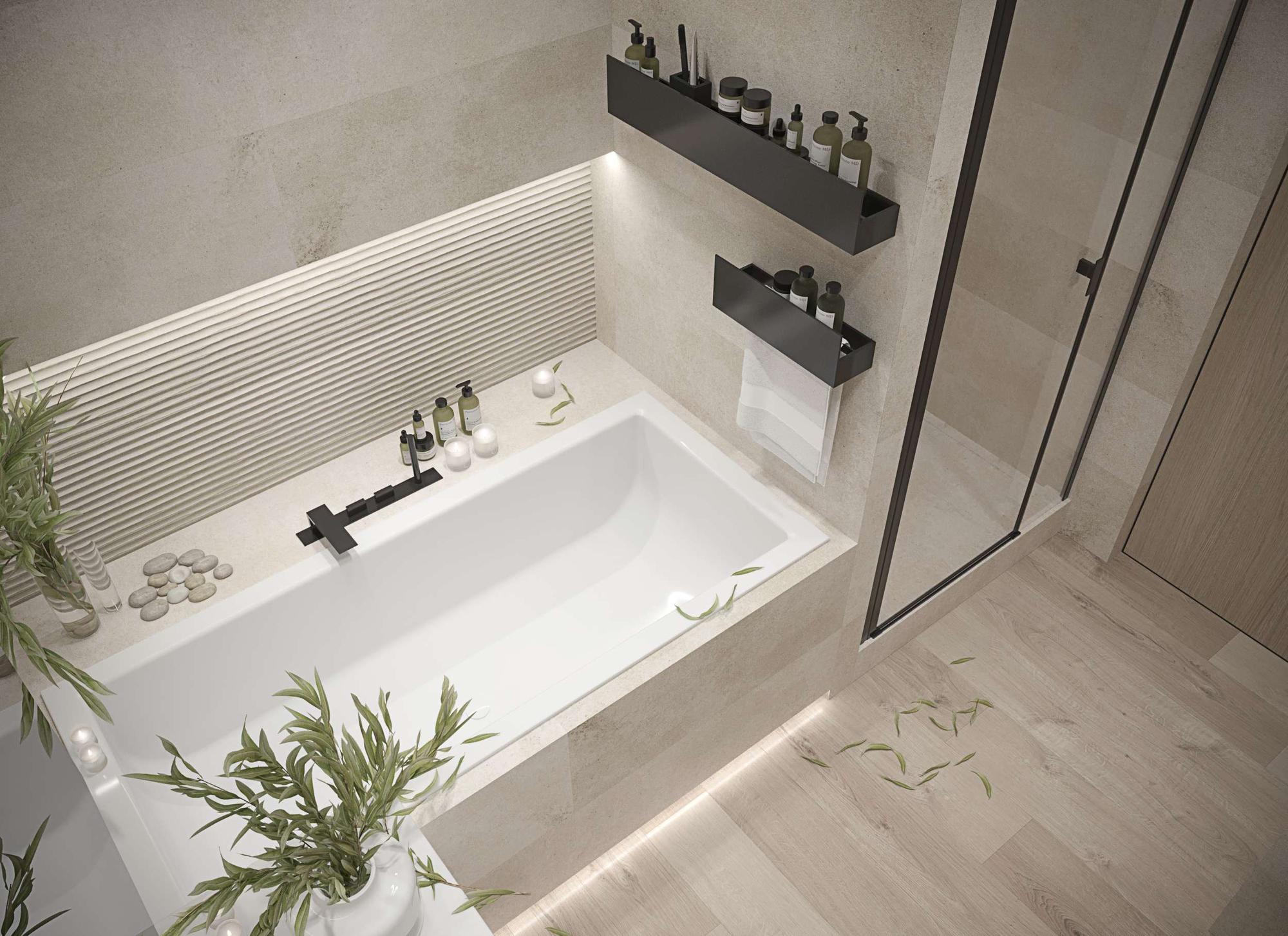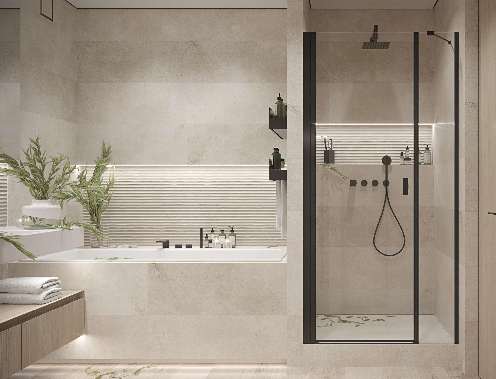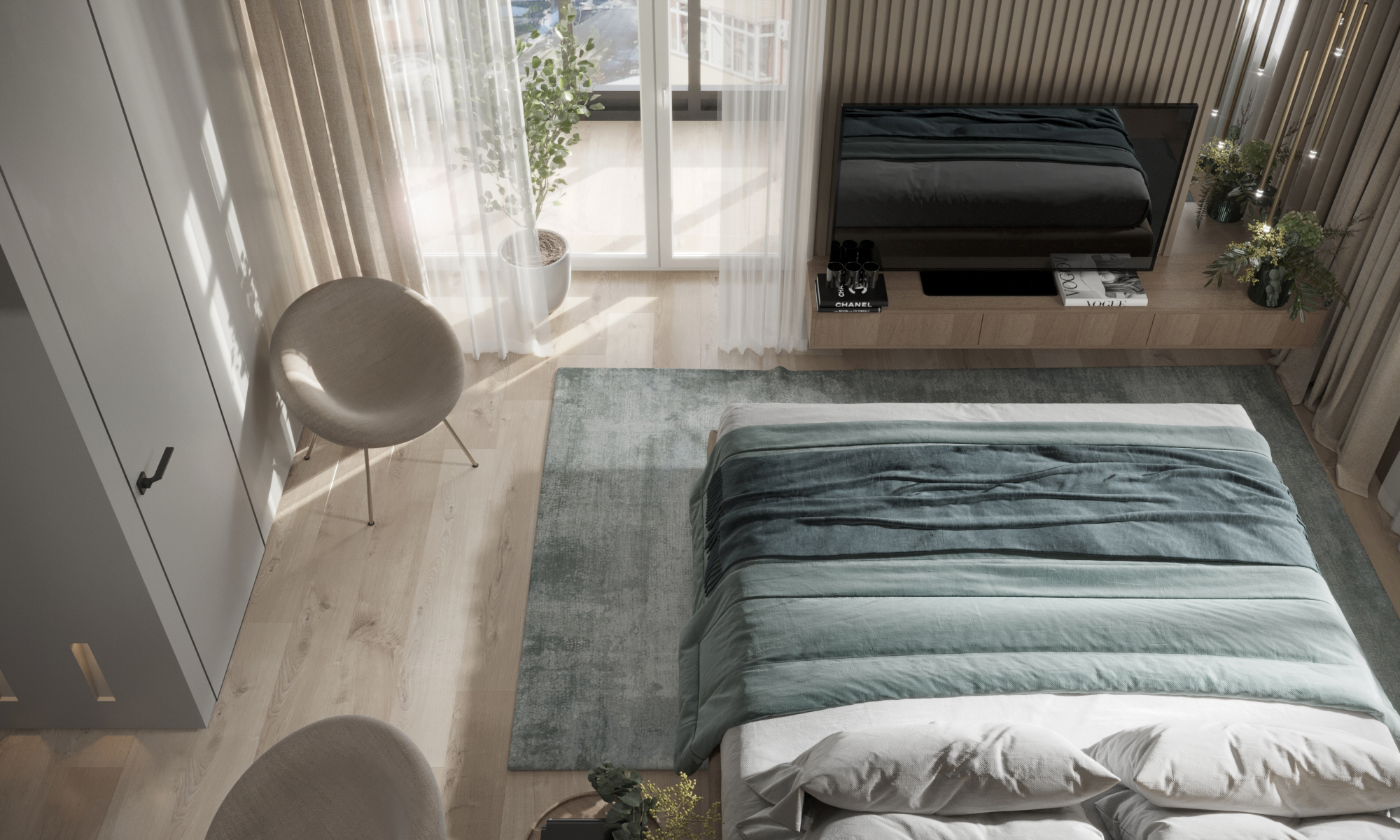 Палитра интерьера выбрана спокойная и расслабленная. Тёплые оттенки песчаника и средне-серый цвет, дополняют и уравновешивают друг друга по всей квартире. Акцентом идут чёрные графичные линии теневого профиля и магнитной системы освещения. Они замыкают и объединяют все помещения в единый контур. Ощущение цельности всего объёма квартиры придаёт напольное покрытие, которое сплошным полотном без перепадов уровня и порогов идет по всей квартире, а также скрытые двери в потолок под штукатурку. С помощью таких дверей возможно решение задачи визуального изменения пространства. Плоскость таких дверей в открытом, закрытом или полуоткрытом состоянии имитирует стену от пола до потолка, создавая архитектурное преломление плоскостей, света и тени и визуально вытягивает помещение вверх.