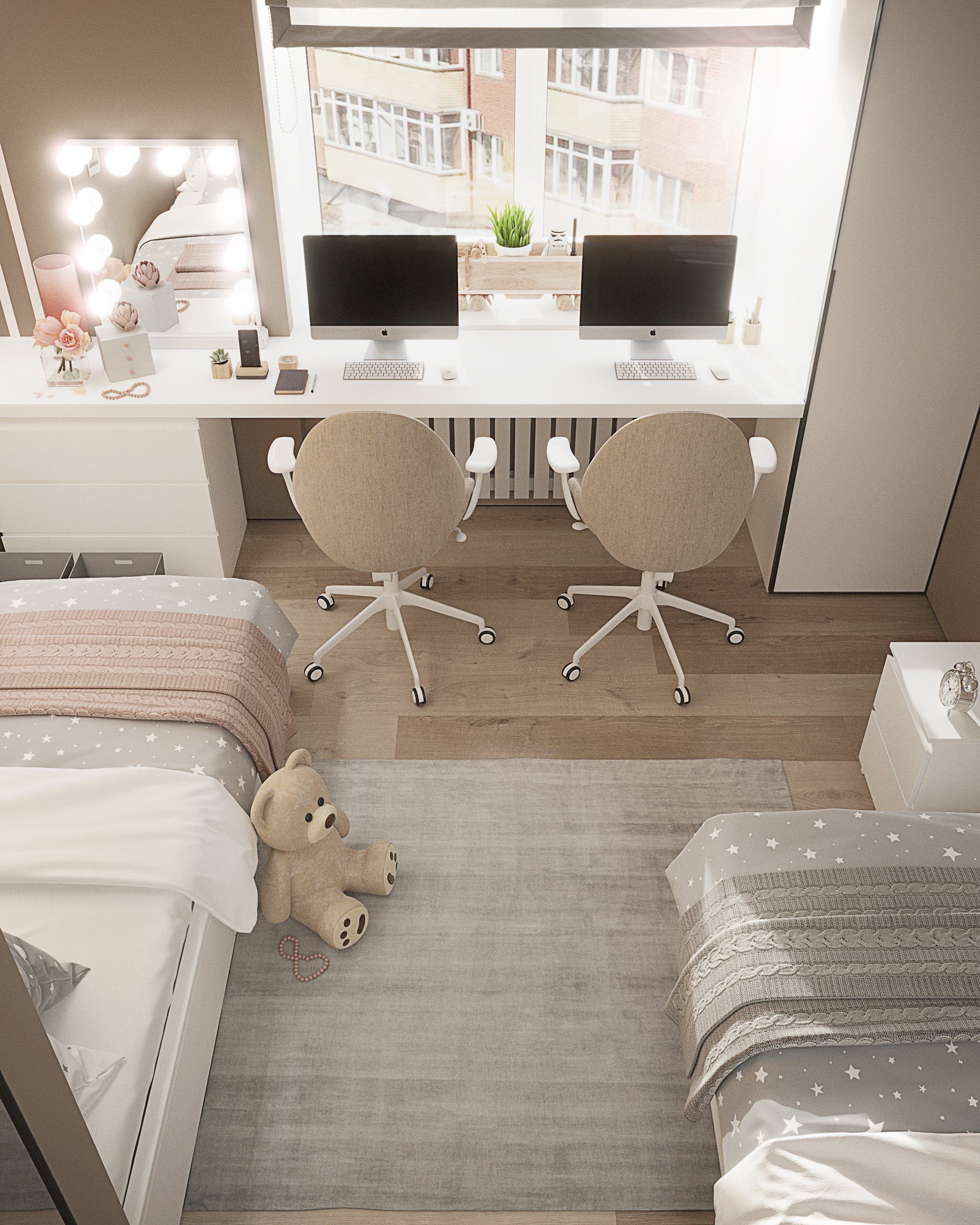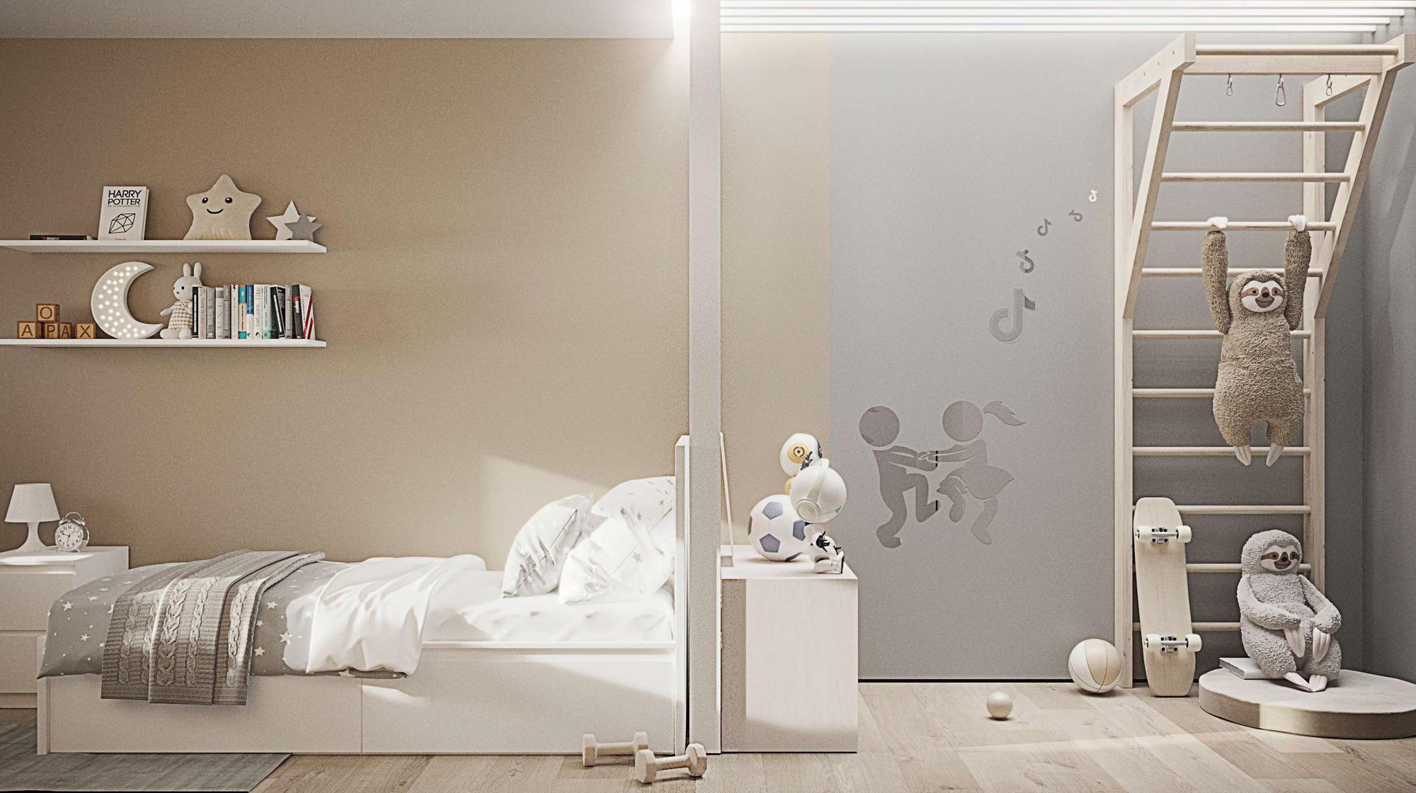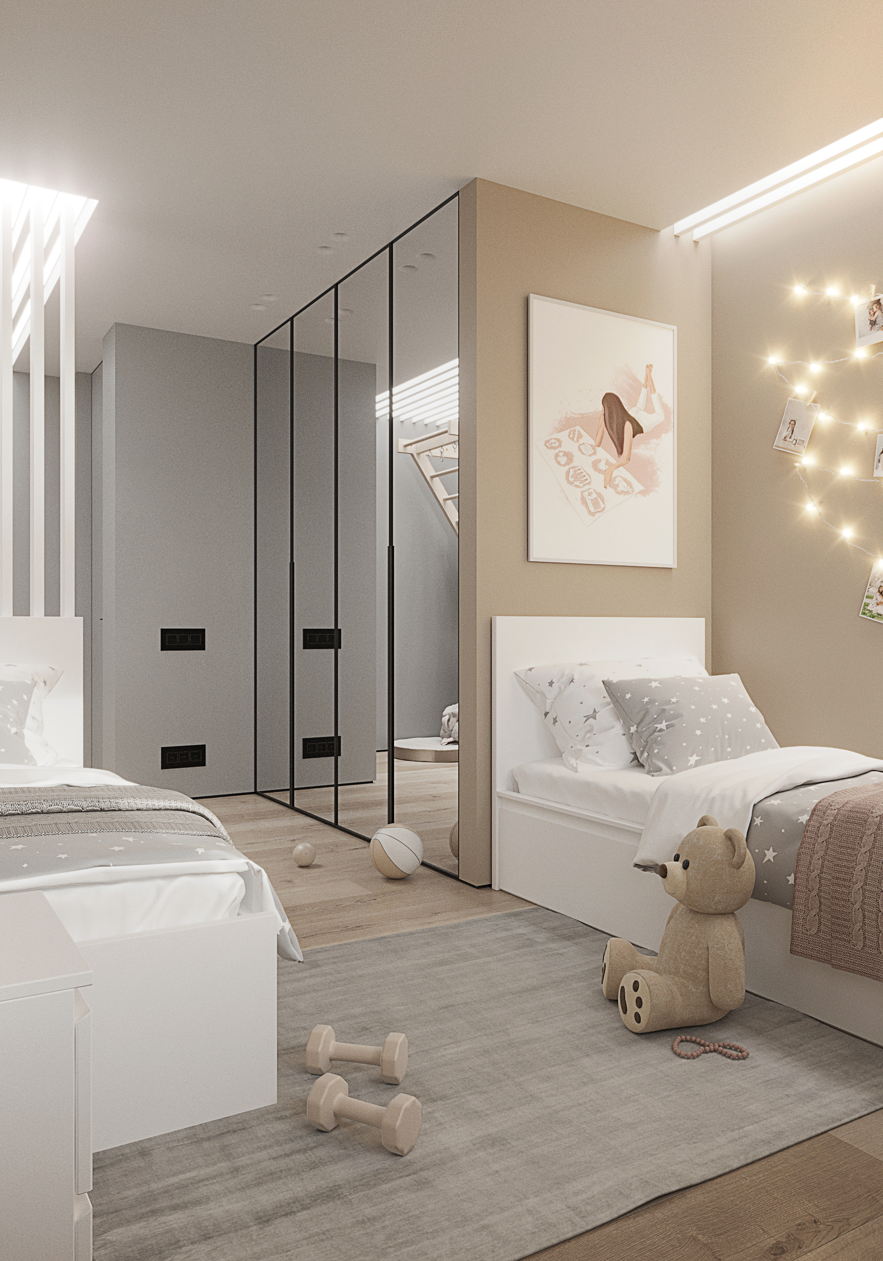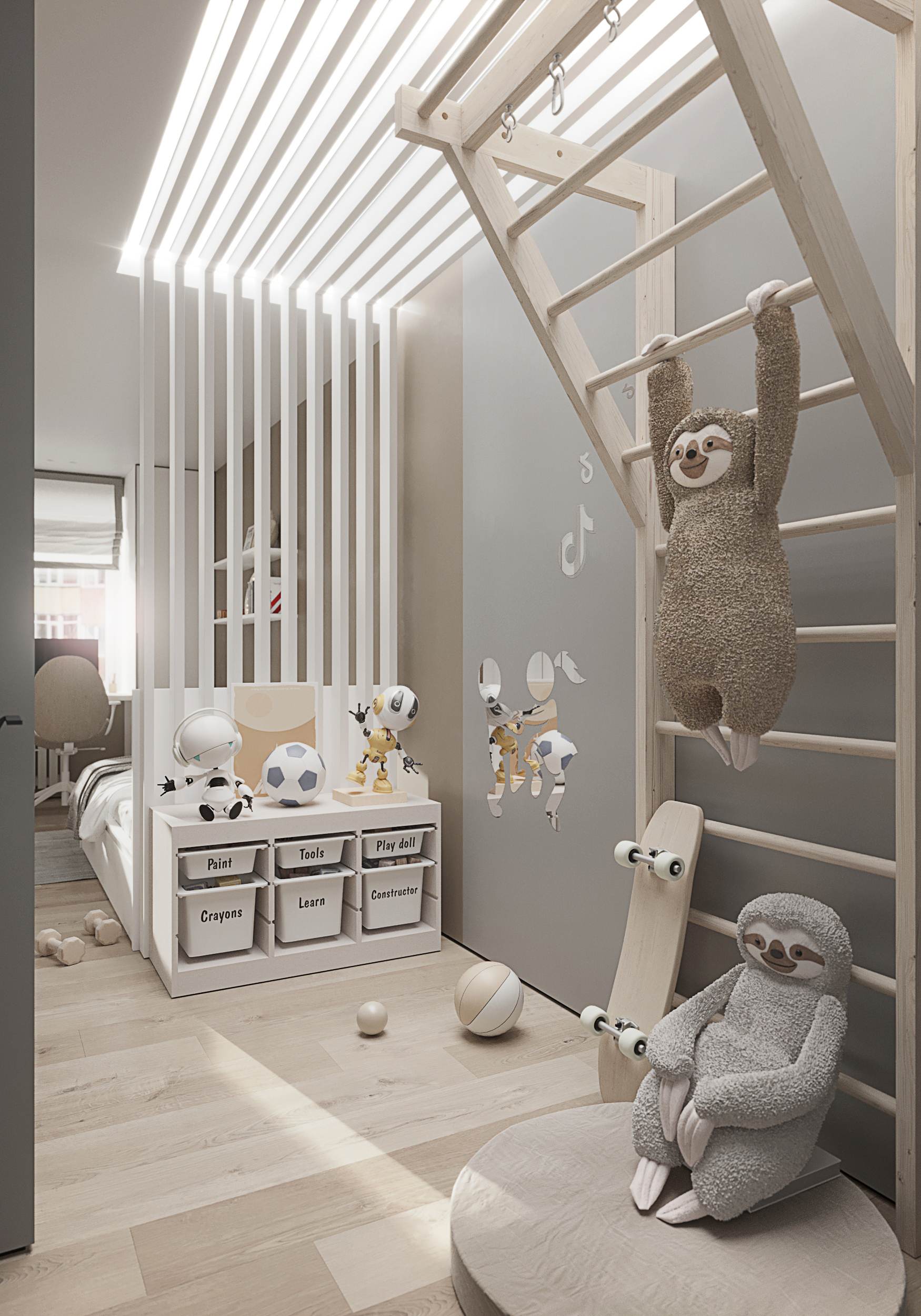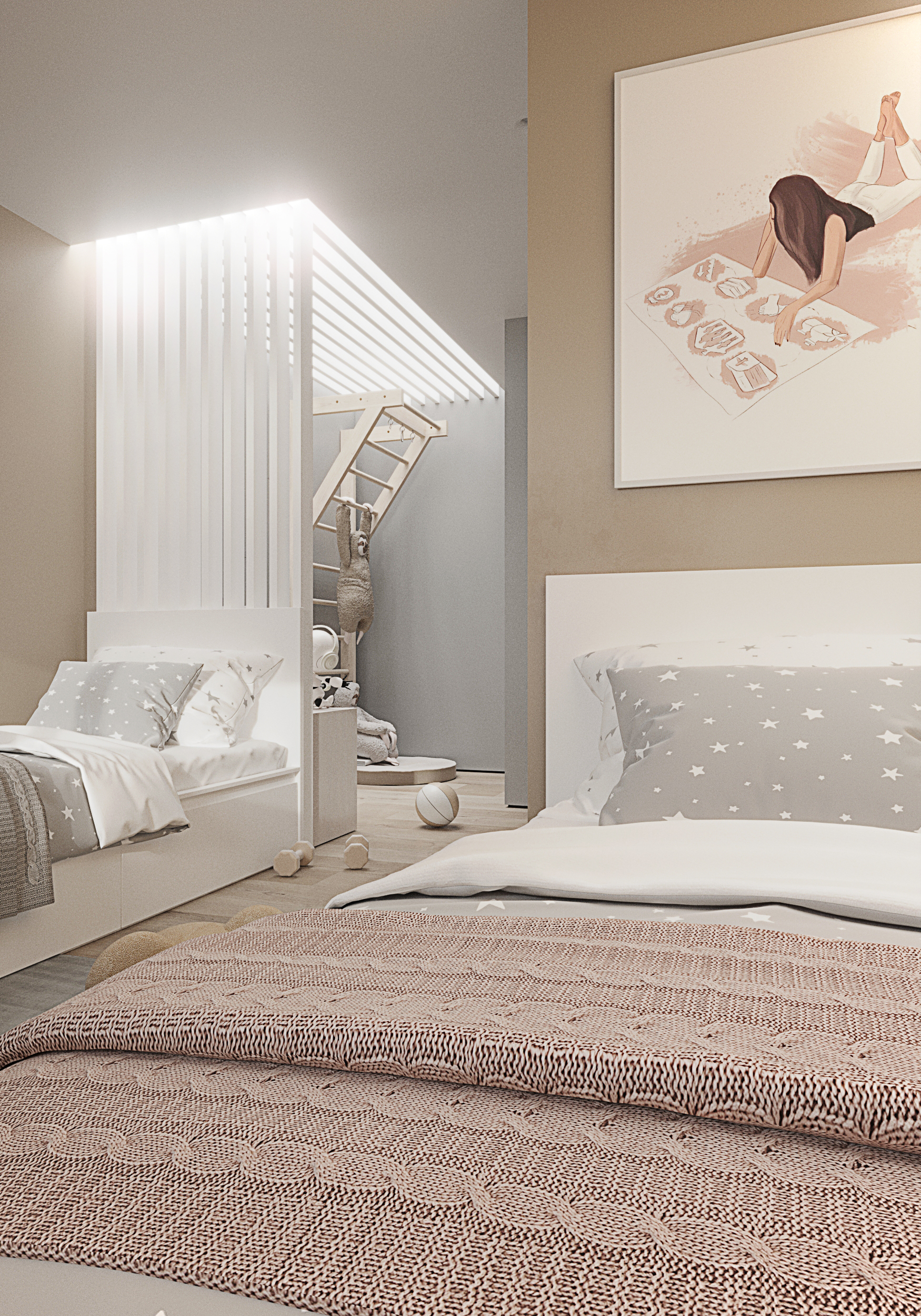 Большой санузел со скрытым местом для постирочных работ. Детская комната общая, для мальчика и девочки, но благодаря неправильной геометрии данного помещения, его удалось удобно зонировать и даже сделать зону для игры и спорта. Планировка спальни родителей получилась со смежными окнами и вместительной гардеробной.