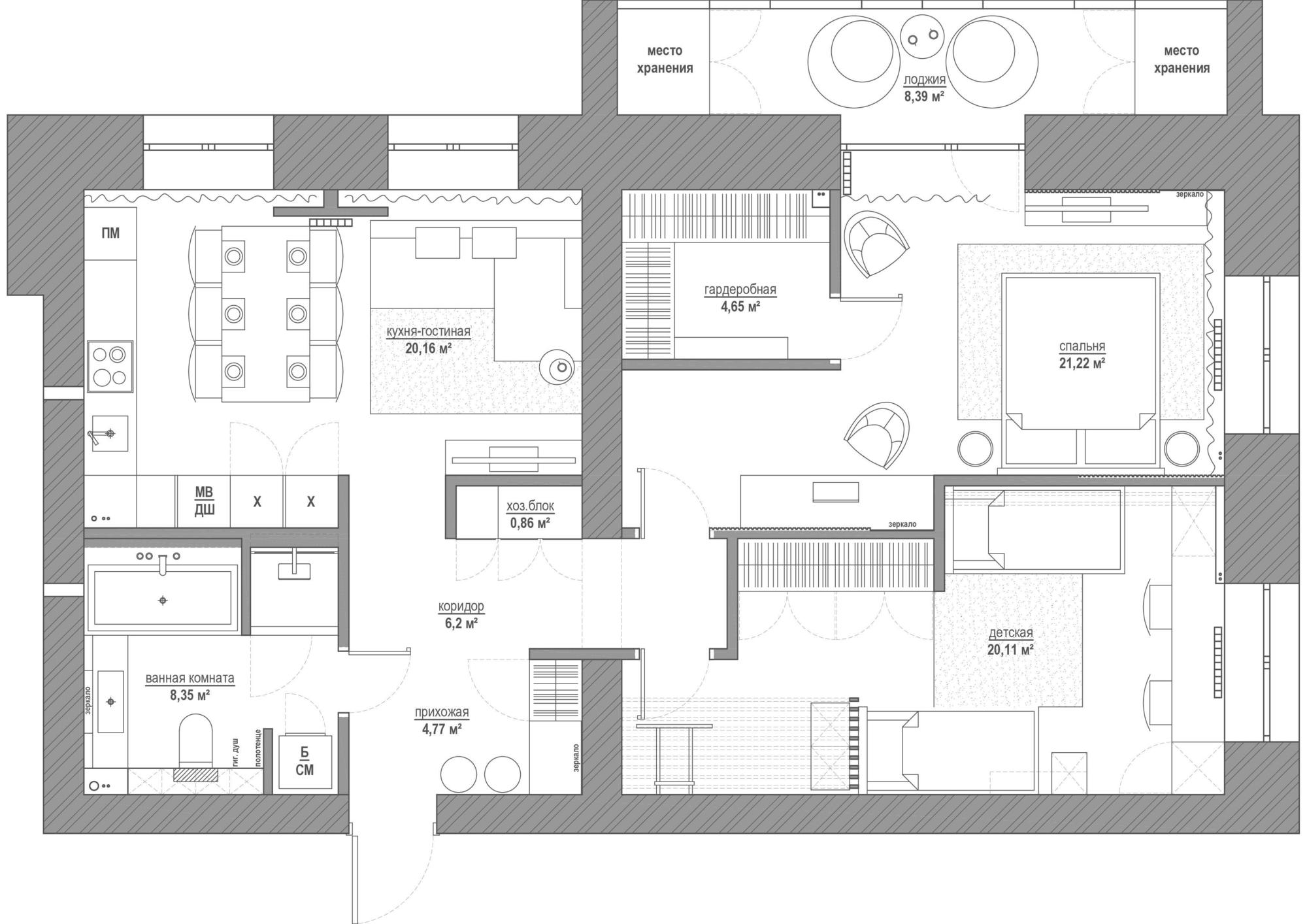 Как и в большинстве моих проектов, заказчик сделал акцент на комфортное жильё.
